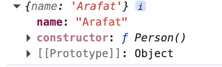 function Person(name) { this.name = name; } const p1 = new Person("Arafat"); console.log(p1.name); // Arafat